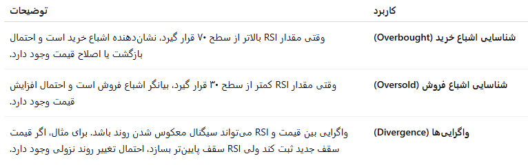 اندیکاتور RSI در تحلیل تکنیکال کاربردهای متعددی دارد. مهمترین این کاربردها عبارتند از: