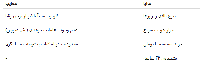 کارمزد خرید و فروش: حدود ۰.۹ تا ۱.۲ درصد بسته به نوع رمزارز