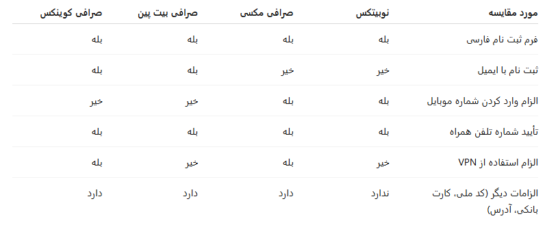 در مقایسه با برخی صرافیهای دیگر، ملزومات افتتاح حساب نوبیتکس غالباً سادهتر و کمدغدغهتر است. در جدول زیر مقایسهای میان نوبیتکس و چند صرافی دیگر ارائه شده است: