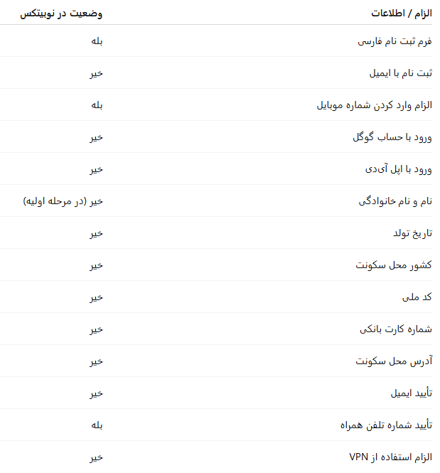 در جدول زیر شرایط و ملزومات افتتاح حساب در نوبیتکس را مشاهده میکنید: