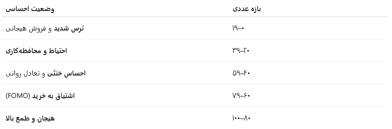 شاخص ترس و طمع نمایش عددی از احساسات بازار (۰ تا ۱۰۰) است.