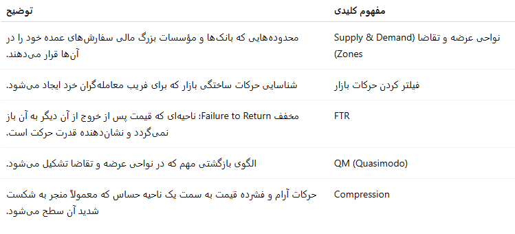 در ادامه، مفاهیم کلیدی مورد استفاده در پرایس اکشن RTM را مرور میکنیم:
