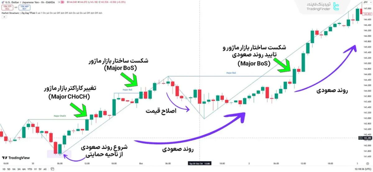 در نمودار جفت ارز دلار آمریکا به ین ژاپن (USD/JPY)، پس از برخورد قیمت به ناحیه حمایتی و وقوع تغییر کاراکتر (CHoCH)، نشانههایی از تغییر روند مشاهده میشود. با ادامه این تغییر و وقوع شکستهای متوالی ساختار (BoS)، فرصتهای معاملاتی برای ورود به موقعیتهای خرید فراهم میشود.