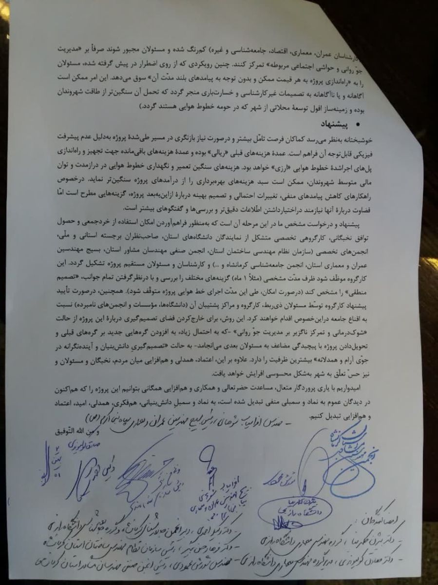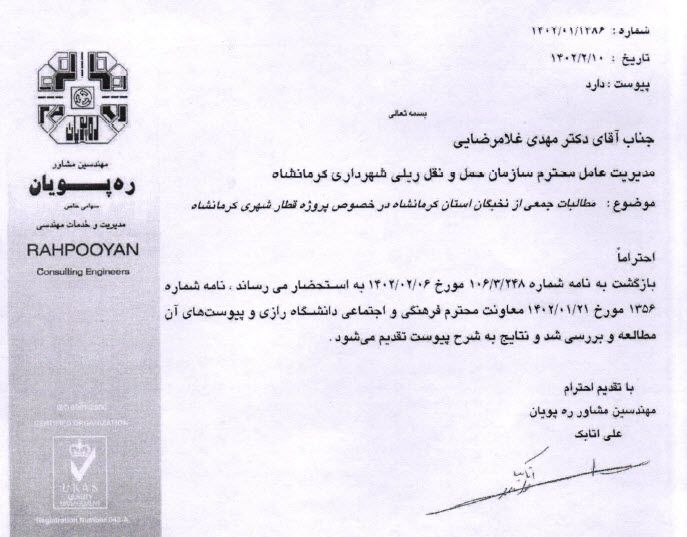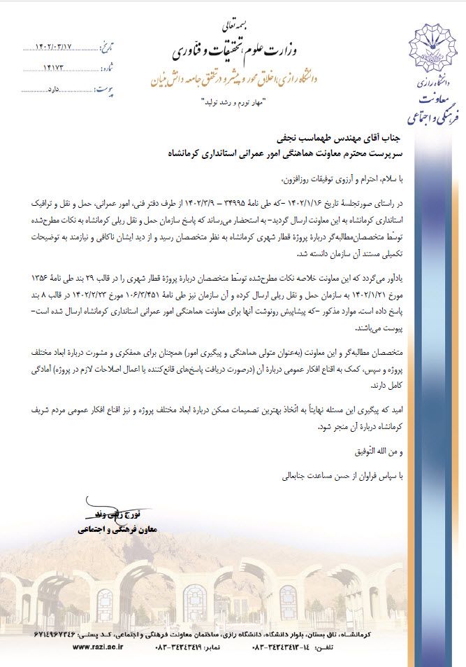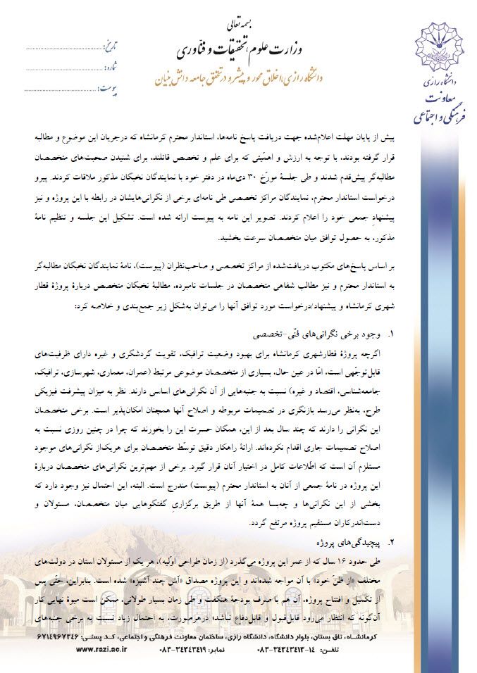 دانشگاه رازی در تاریخ 1402/1/21 یعنی پس از 5 روز، طی نامهای خلاصۀ نقطهنظرات متخصصان مطالبهگر را در قالب 29 بند به سازمان حمل و نقل ریلی کرمانشاه اعلام و رونوشت نامه را به معاون عمرانی استانداری و شهردار ارسال کرد (تصاویر زیر).