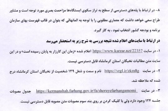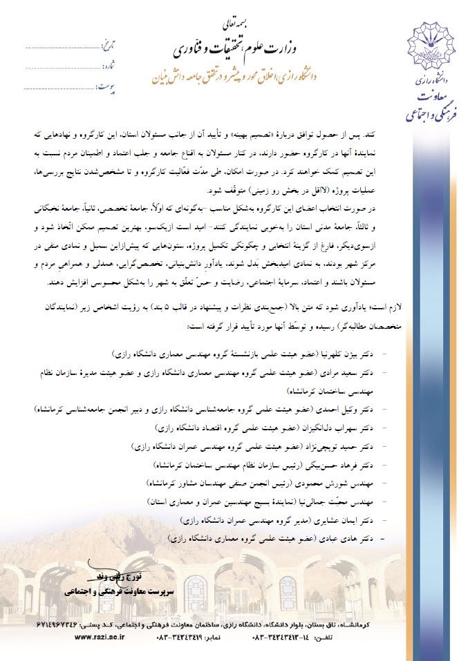 معاونت فرهنگی و اجتماعی دانشگاه رازی در تاریخ 1401/11/11 طی نامۀ شماره 57690، نگرانیهای نخبگان را بهشکل جامع و مانعی به مدیرکل ارشاد استان (به عنوان دبیرخانه شورای فرهنگ عمومی استان که در این رابطه مصوبهای به تصویب رسانده بود) انتقال داد (نامۀ زیر).
