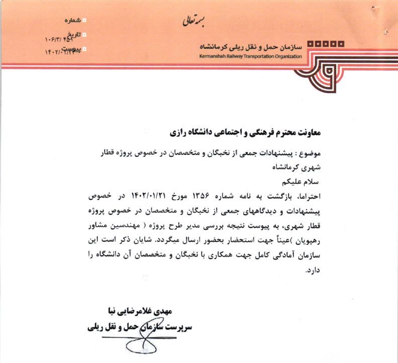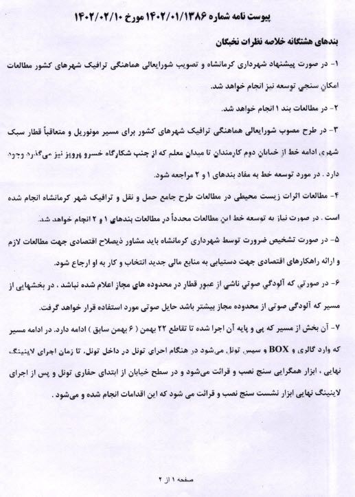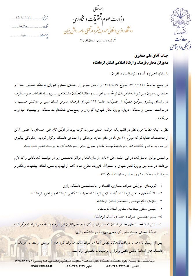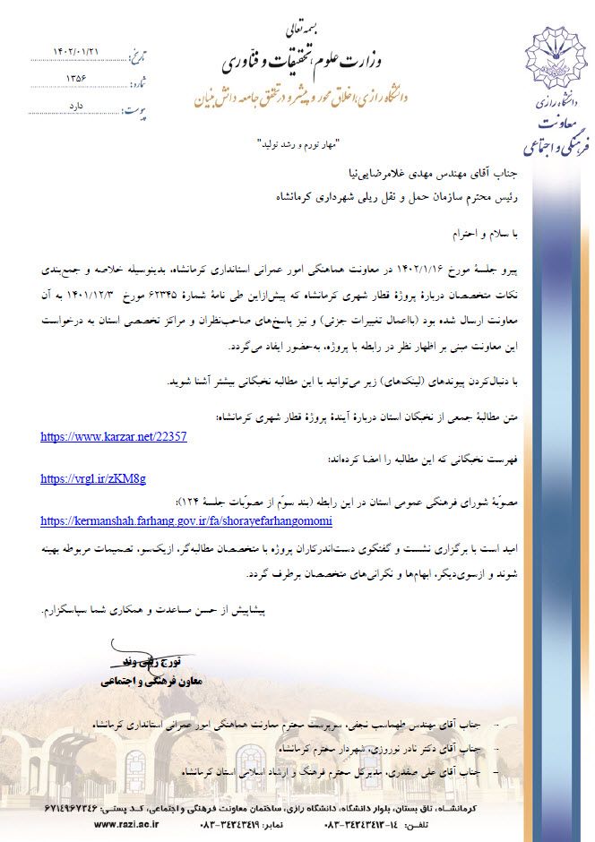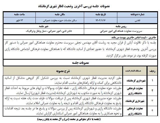 در جلسۀ مورّخ 1402/1/16 در معاونت عمرانی استانداری و با حضور شهردار و مسئولان سازمان حمل و نقل ریلی کرمانشاه، مصوّب شد که دانشگاه رازی نقطهنظرات، سئوالات و ابهامهای مورد نظر نخبگان دربارۀ این پروژه را گردآوری، بهصورت مکتوب به شهرداری اعلام و مدیریت قطار شهری شهرداری نیز ظرف یک هفته پاسخ دهد (تصویر زیر، بندهای دوّم و سوّم).