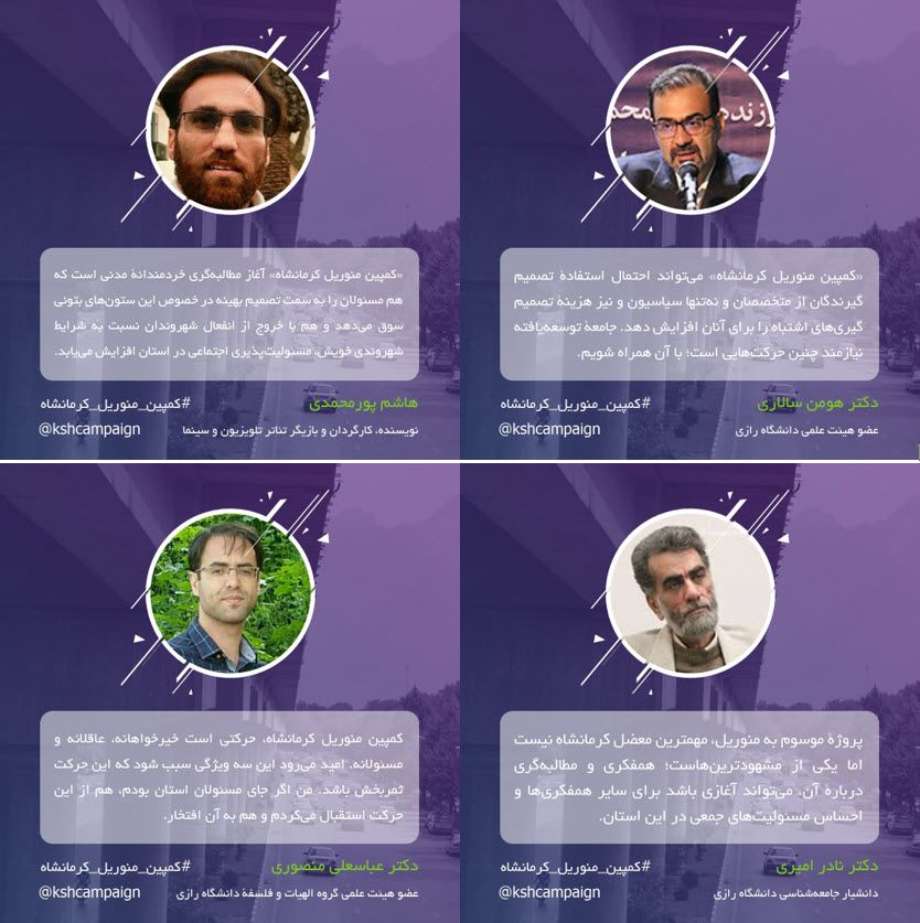 در تاریخ 13 آذر ماه 1400، جمعی از دانشگاهیان، اصحاب رسانه و کنشگران مدنی کرمانشاه «کمپین منوریل کرمانشاه» را راهاندازی و «درخواست تصمیمگیری خردمندانه، شفاف و مشارکتی دربارۀ این پروژه» را خطاب به مسئولان استان در قالب کارزاری مجازی ثبت کردند. خواستۀ اصلی و محوری آنان از مسئولان فقط این بود که باب گفتگوهای نخبگانی را با متخصصان مرتبط با این پروژه باز کنند و مردم را نیز در جریان امور قرار دهند.