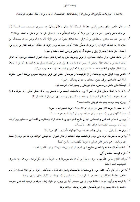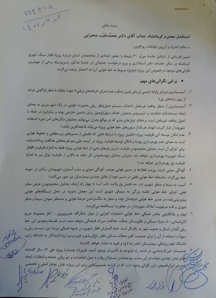 سازمان حمل و نقل ریلی کرمانشاه پس از 33 روز، نقطهنظرات متخصصان را طی نامهای و در قالب 8 بند پاسخ داد (تصویر زیر).