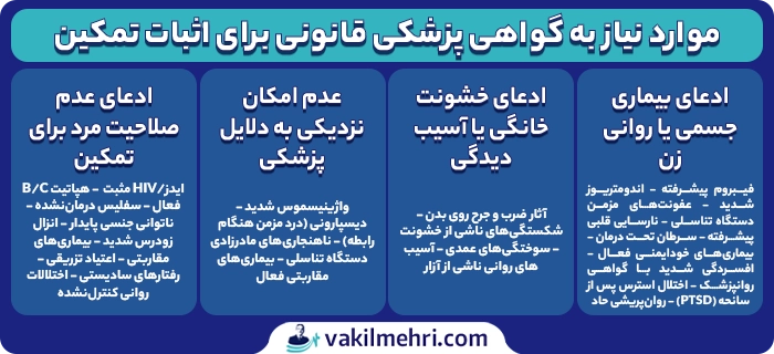 موارد نیاز به گواهی پزشکی قانونی در تمکین در ادامه آورده شدهاند.