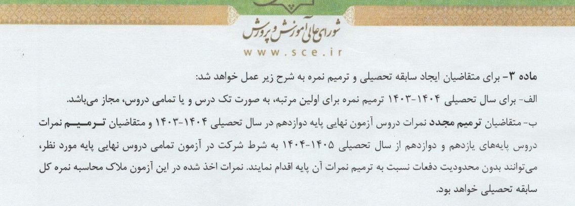 ترمیم برای سال 1403-4-1404 به صورت تک درس هست ولی از سال تحصیلی 1404-1405 دانش آموزان باید تمامی دروس را امتحان بدهند و همین نمرات هم برای آن های ثبت می شود.