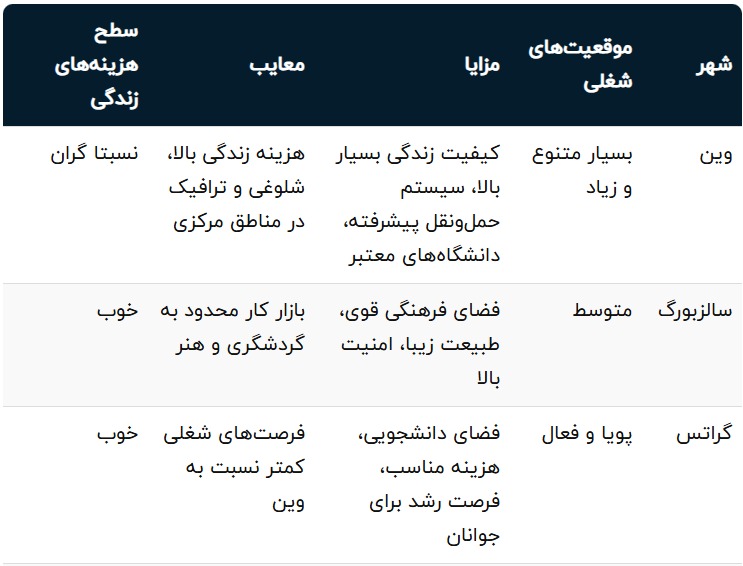 در این مقاله قرار است بهترین شهرهای اتریش برای زندگی، کار و تحصیل را معرفی کرده و یک مقایسه کلی داشته باشیم، پس اگر در مسیر مهاجرت به اتریش هستید، برای انتخاب آگاهانهتر با ما همراه باشید.