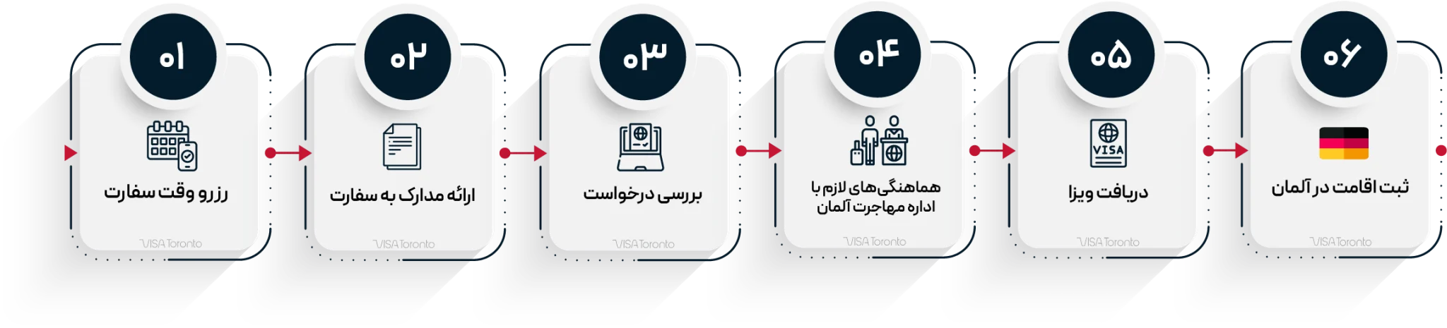 اول از همه مدارک جدول بالا را در دارالترجمههای رسمی ترجمه گرفته و تاییدیه بگیرید. تا مدارکتان آماده میشود، از طریق لینک رزرو وقت مصاحبه برای وقت سفارت اقدام کرده و در روز مراجعه حتما 30 دقیقه زودتر در محل حاضر باشید. بعد از بیموتریک و مصاحبه احتمالی، طی 8 تا 12 هفته کاری نتیجه ویزا با هماهنگی اداره مهاجرت به اطلاعتان خواهد رسید. در این مرحله میتوانید بلیت گرفته و برای تبدیل ویزا به اجازه اقامت به آلمان سفر کنید.