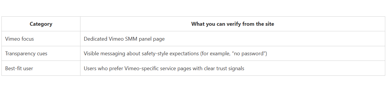 CategoryWhat you can verify from the siteVimeo focusDedicated Vimeo SMM panel pageTransparency cuesVisible messaging about safety-style expectations (for example, “no password”)Best-fit userUsers who prefer Vimeo-specific service pages with clear trust signals
