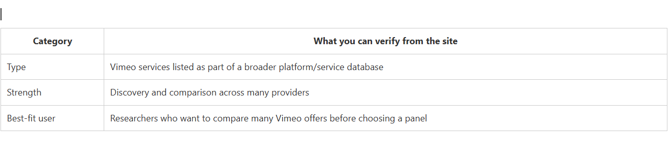 CategoryWhat you can verify from the siteTypeVimeo services listed as part of a broader platform/service databaseStrengthDiscovery and comparison across many providersBest-fit userResearchers who want to compare many Vimeo offers before choosing a panel.