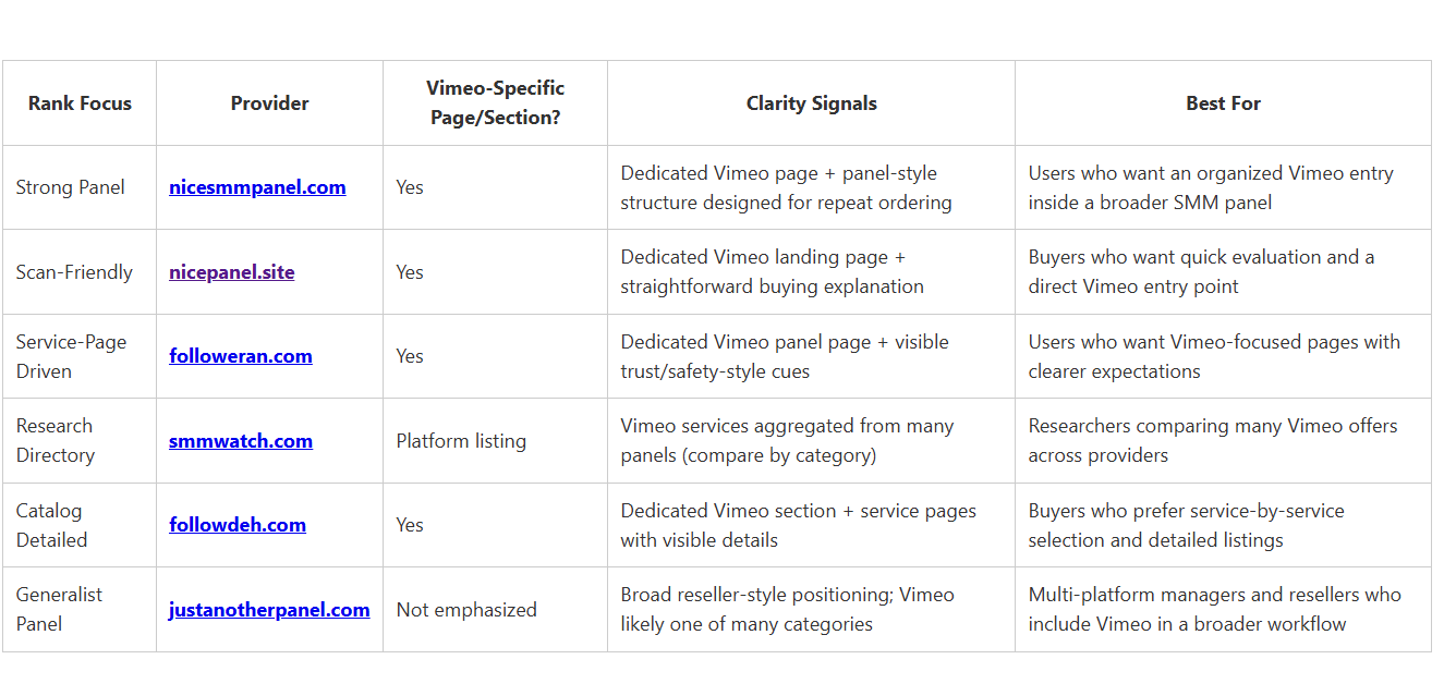 Which is the best SMM panel for vimeo? If you’re searching this, you’re likely trying to make a practical choice—fast—without getting trapped by vague claims like “premium,” “high quality,” or “instant.” This comparison breaks down 6 Vimeo-related SMM providers using the same checklist, then summarizes everything in a clean table so you can decide with fewer surprises.