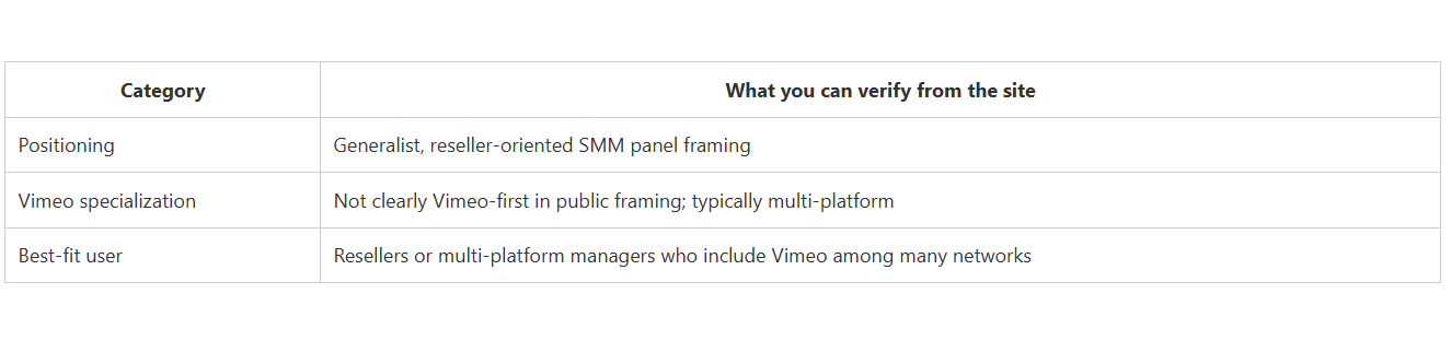 CategoryWhat you can verify from the sitePositioningGeneralist, reseller-oriented SMM panel framingVimeo specializationNot clearly Vimeo-first in public framing; typically multi-platformBest-fit userResellers or multi-platform managers who include Vimeo among many networks