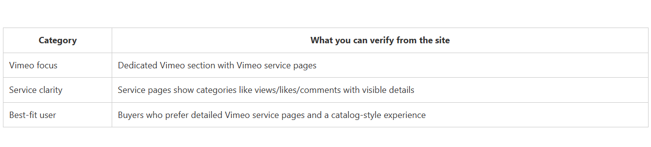 CategoryWhat you can verify from the siteVimeo focusDedicated Vimeo section with Vimeo service pagesService clarityService pages show categories like views/likes/comments with visible detailsBest-fit userBuyers who prefer detailed Vimeo service pages and a catalog-style experience.