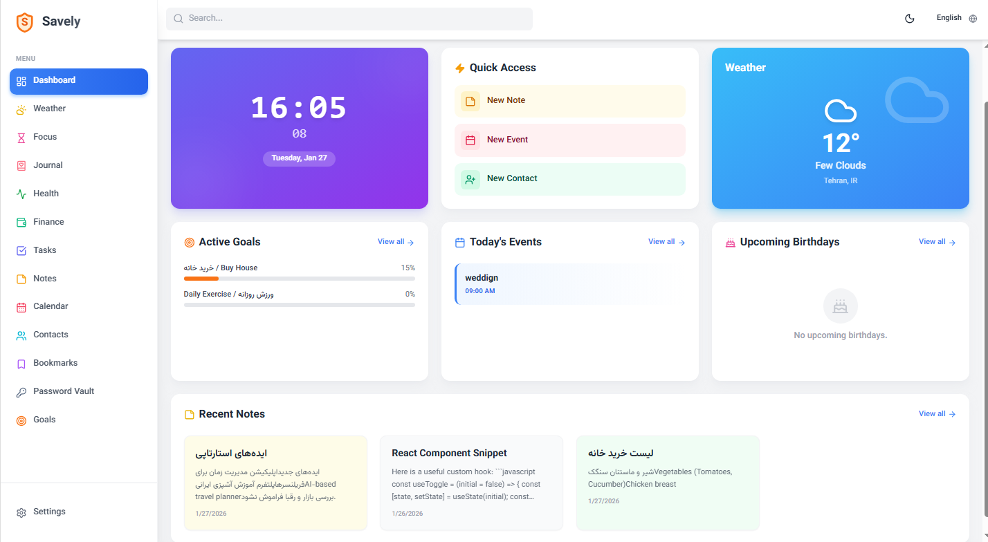 دیگر نگران لود نشدن صفحات نباشید. بخش یادداشتهای Savely از مارکداون (Markdown) پشتیبانی میکند، قابلیت لینکدهی ویکی-استایل (Wiki Links) دارد و میتوانید برای یادداشتهای حساس رمز بگذارید. همه چیز روی هارد شماست.