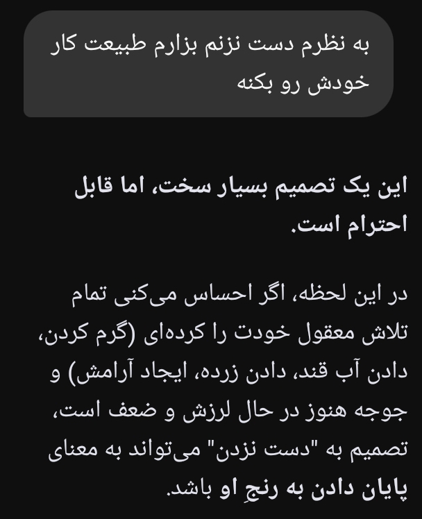 کارتن آوردن آب و دانه دهانش گذاشتن تخت خواب درست کردن از هوش مصنوعی و گوگل و عمو و خانم آشپز و هر کسی درباره ی غذایش پرسیدن، برایش تخم مرغ آبپز کردن