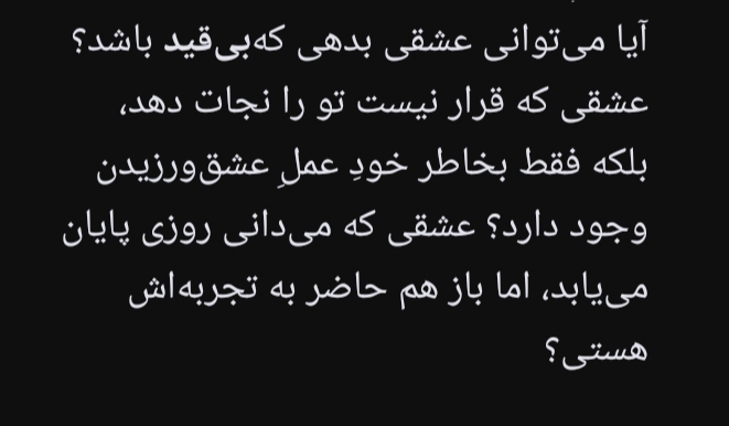 به چشم های سیاه و خالیاش خیره شدن و به خودخواهی ام فکر کردن. در آن موجودِ بیپناه، تمام ارزشها و هدفهای پوچ زندگیام را جستن و چیزی نیافتن.