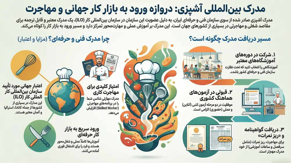۸. مدرک فنی حرفهای برای مهاجرت کافیه؟ بله، طبق آمارهای سال ۱۴۰۴، حدود ۴۰٪ مهاجران آشپز ایرانی از طریق همین مدرک و ترجمه رسمی آن اقدام کردهاند.