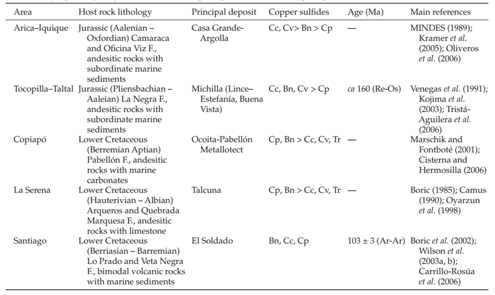 آریكا – ایكویكو، توکوپيلا – تالتال، کوپياپو ، لاسرنا و سانتياگو. بيشتر کانسارهای این مناطق در توالی سنگهای آتشفشانی رسوبی دوران ژوراسيک تا کرتاسه پایينی تشكيل شدهاند و خلاصۀ ویژگیهای زمينشناسی در مقاله ساتو (۱۹۸۴)، بررسی و آورده شده است. کانسارهای منطقه شمالی (توکوپيلا تالتال و آریكا ایكویكو) در یک کمربند کوهزایی در امتداد حاشيه ساحلی واقع گردیده است و در مقابل آن کانسارهای بخش مرکزی شيلی (سانتياگو، لاسرنا و کاپياپو)، در حوضههای پشت کمان درون قارهای به صورت پراکنده میباشند.