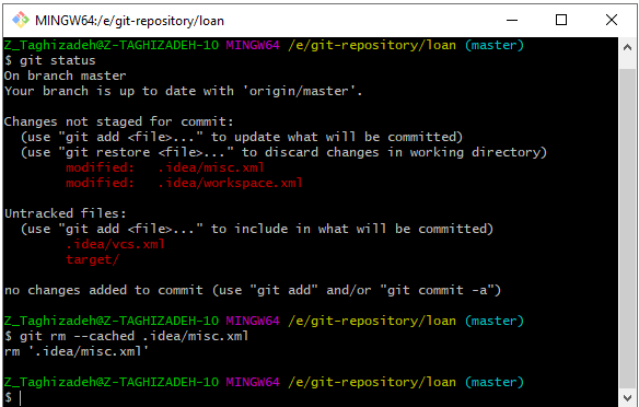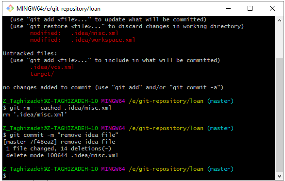 بعد فایلی (idea/misc.xml)که به اشتباه قبلا فرستاده اید به گیت را با دستور بالا وارد کنید و enter رو بزنید.