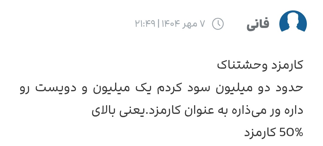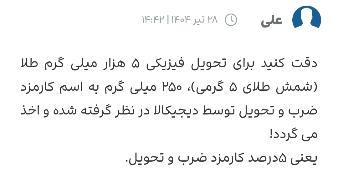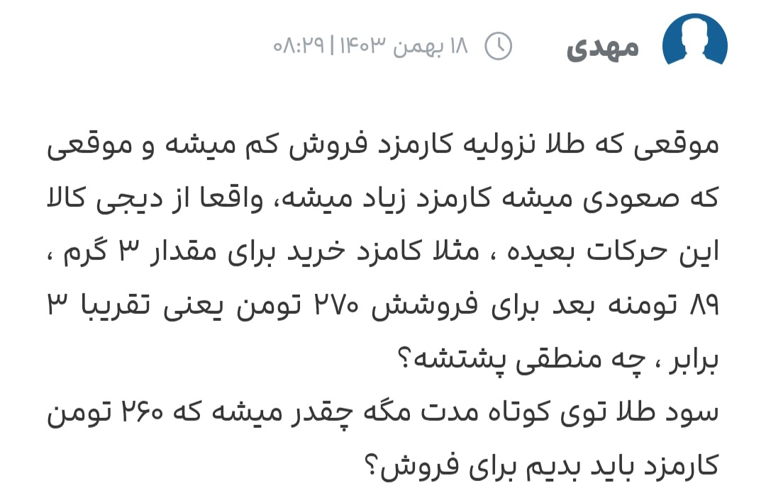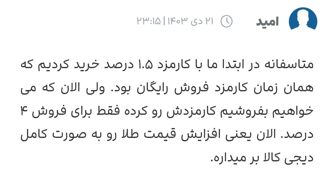 کامنت ها نیاز به بحث یا توضیح اضافه ای ندارن، خودشون گویای همه چیز هستن با اینکه ریاضی من ضعیف هست و اونقدر پول نداشتم که بدونم این کارمزد و اجرت ساخت چی چی هست ولی به هرحال میدونم که مثل عرصه و اعیان یک ملک طلا هم یک هزینه ای داره که علاوه بر ارزش اصلی اون طلا یک مبلغ اضافه ای رو باید به عنوان کارمزد پرداخت کنی و گویا دیجی کالای عزیز توی این مورد خیلی زیاده روی میکنه دوستان نظرات مختلفی دارن که نشون میده دیجی کالا در روزهای مختلف کارمزدهای مختلفی میذاره، یکی از کارمزد ۵۰ درصدی میگه که از ۲ میلیون سودش نیمی رو باید به دیجی کالا بده، یکی از کارمزد سه برابری میگه و یکی از کارمزد ۴ درصدی همه اینها زیادن طوری که به نظر میرسه سایت های دیگه کارمزدهای نیم درصدی دارن و این کارمزدهای دیجی کالا به شدت بالا هست