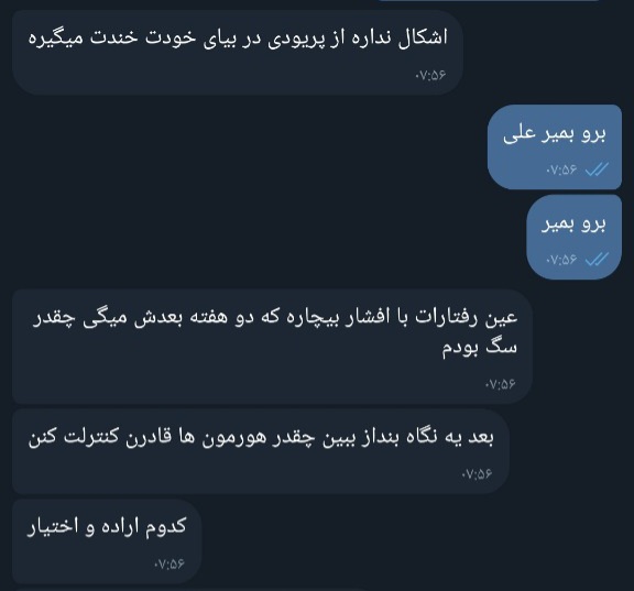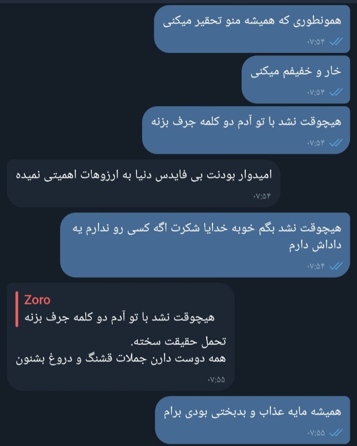 ای کاش میتونستم مغزم رو به مغز شماها متصل کنم و بهتون نشون بدم که چطور "تحقیر کلامی" از صد تا کتک و شلاق هم بدتره، اگر کتک میخوردم در نهایت یک رد و اثری ازش وجود داشت که بتونم بهتون نشون بدم و بگم ببینید، من چنین عذابی میکشم ولی تحقیر ... چطوری بهتون نشون بدم؟ به کجا به کی شکایت کنم؟ وقتی زمان میگذره حتی مغز خودم هم یادش میره که چطوری تحقیر شده فقط انگار یک رد زخم روی روح و روانت باقی میذاره، تحقیر کلامی در گذر زمان مثل ۵ سال و ۱۰ سال کم کم باعث میشه از درون خورد بشی و خودت رو همیشه دست کم بگیری همیشه مثل یه موجود منفعل گوشه رینگ نشسته باشی چون میترسی دوباره توی جمع کاری بکنی و بعد اون آدمها دوباره آتویی برای تحقیر تو پیدا کنن، با اینکه بارها و بارها بهش میگی که این کار رو نکنه و تحقیرت نکنه اما اون آدم دست از سرت برنمیداره و این عذاب تا بینهایت ادامه داره مگر روزی که از این خونه و خونواده بیمار جدا بشی اما چطوری؟ چطوری میتونی بدون شوهر کردن بدون داشتن سرمایه اولیه خودت رو از این دیوونه خونه نجات بدی؟
