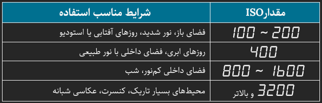 جدول کاربرد ISO در شرایط نوری مختلف