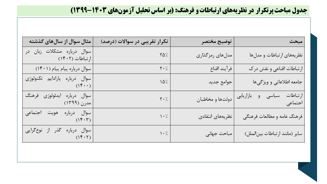 درس کلیدی با تمرکز بر مدلهای理论ی. مباحث پرتکرار شامل نظریههای ارتباطات، مدلهای ارتباطی و جامعه اطلاعاتی است که در بیش از ۵۰ درصد سوالات اخیر ظاهر شدهاند.