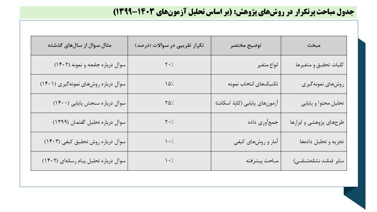 این درس بر ابزارهای تحقیق تمرکز دارد و مباحث پرتکرار شامل روشهای نمونهگیری، تحلیل محتوا و پایایی است. سوالات اغلب کاربردی هستند و در آزمون ۱۴۰۲، سوالاتی مانند آزمونهای پایایی (آلفا، کاپا) تکرار شدهاند.