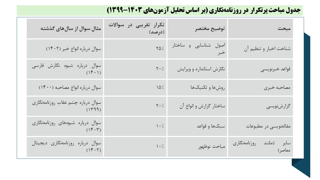 جدول مباحث پرتکرار در روزنامهنگاری (بر اساس تحلیل آزمونهای ۱۳۹۹-۱۴۰۳):