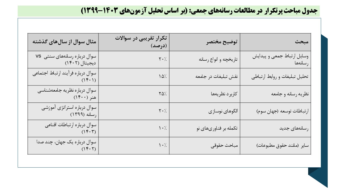 مباحث پرتکرار و مهم در این دروس بر اساس بررسی منابع، آزمونهای آزمایشی و سوالات سالهای گذشته، اغلب شامل موضوعاتی است که پایهای و کاربردی هستند، مانند مدلهای ارتباطی، روشهای نمونهگیری، خبرنویسی و نظریههای رسانه. با این حال، با توجه به تغییرات احتمالی در طراحی سوالات، تمرکز بر منابع رسمی و تحلیل سوالات ادوار گذشته ضروری به نظر میرسد.