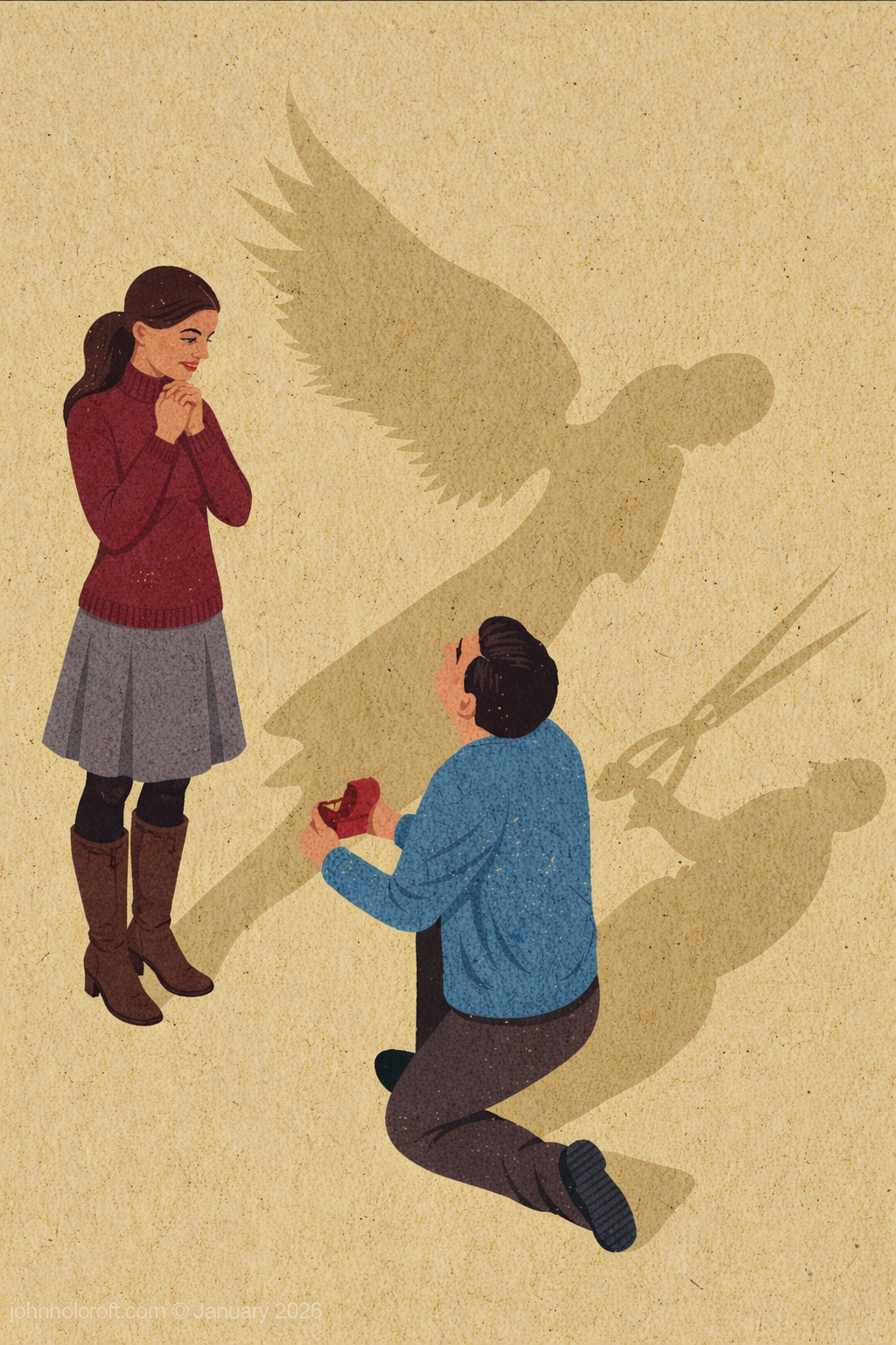 در سطح آشکار، صحنهای عاشقانه میبینیم؛ پیشنهادی برای تعهد. اما سایهها داستان دیگری روایت میکنند: قیچیای که به سمت بالها نشانه رفته است.