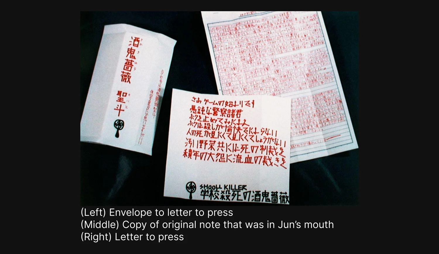 این بازی قتل را شروع کردم، با این حال حتی الان هم نمیفهمم چرا از کشتن لذت میبرم، این چیزی است که من آن را ذاتی و یک غریزه طبیعی میدانم، فقط وقتی میکشم، آیا از آن آزاد میشوم؟ نفرتی که در من وجود دارد؟ آیا میتوانم آرامش پیدا کنم؟ فقط درد دیگران میتواند درد خودم را تسکین دهد؟ در نتیجه، من معتقدم که تقریباً متوجه نوع نوشته شده روی این مقاله شدهاید، اما من به وجود خودم وابستگی دارم که از مردم عادی فراتر میرود. بنابراین نمیتوانم تحمل کنم که اسمم اشتباه تلفظ شود یا وجودم لکهدار شود. با مشاهده حرکات فعلی پلیس، به نظر میرسد که با وجود اینکه در درونم آن را مشکلساز میدانم، آنها عمداً اسم من را پنهان میکنند. سعی میکنند وجودم را پاک کنند. من در این بازی جانم را به خطر میاندازم، اگر دستگیر شوم. احتمالاً به دار آویخته خواهم شد، بنابراین در حالی که نمیگویم پلیس باید جان خود را به خطر بیندازد، من فقط یک جنایتکار تازهکار نیستم که میتواندفقط بچهها را بکشد. من توانایی کشتن یک نفر را دارم از این به بعد دو بار اگر اسم من را اشتباه بخوانید یا حالم را خراب کنید، سه سبزی -انسان- را در هفته خواهم کشت.