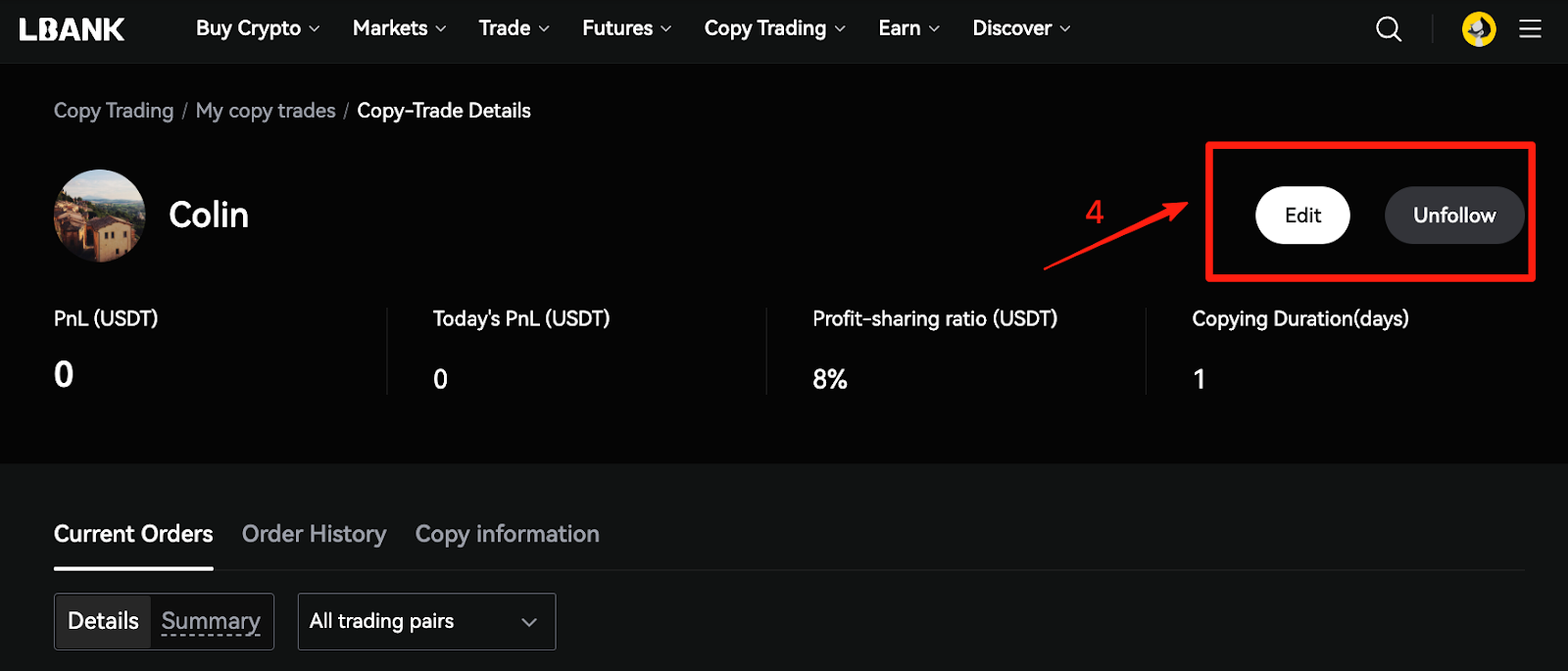 ۱. وارد بخش «معاملات کپی من» شوید، «معاملهگر پیشرو» را انتخاب کنید، به قسمت «جزئیات» بروید و با کلیک روی «ویرایش»، تنظیمات کپی تریدینگ را اصلاح کنید یا دنبال کردن معاملهگر را متوقف کنید.