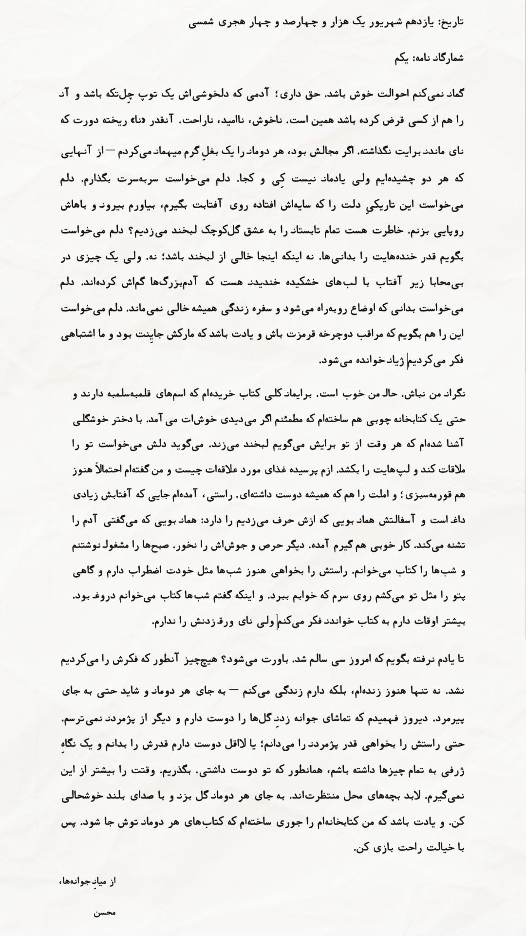 نگران من نباش. حال من خوب است. برایمان کلی کتاب خریدهام که اسمهای قلمبهسلمبه دارند و حتی یک کتابخانه چوبی هم ساختهام که مطمئنم اگر میدیدی خوشات میآمد. با دختر خوشگلی آشنا شدهام که هر وقت از تو برایش میگویم لبخند میزند. میگوید دلش میخواست تو را ملاقات کند و لپهایت را بکشد. ازم پرسیده غذای مورد علاقهات چیست و من گفتهام احتمالاً هنوز هم قورمهسبزی؛ و املت را هم که همیشه دوست داشتهای. راستی، آمدهام جایی که آفتابش زیادی داغ است و آسفالتش همان بویی که ازش حرف میزدیم را دارد: همان بویی که میگفتی آدم را تشنه میکند. کار خوبی هم گیرم آمده. دیگر حرص و جوشاش را نخور. صبحها را مشغول نوشتنم و شبها را کتاب میخوانم. راستش را بخواهی هنوز شبها مثل خودت اضطراب دارم و گاهی پتو را مثل تو میکشم روی سرم که خوابم ببرد. و اینکه گفتم شبها کتاب میخوانم دروغ بود. بیشتر اوقات دارم به کتاب خواندن فکر میکنم ولی نای ورق زدنش را ندارم.