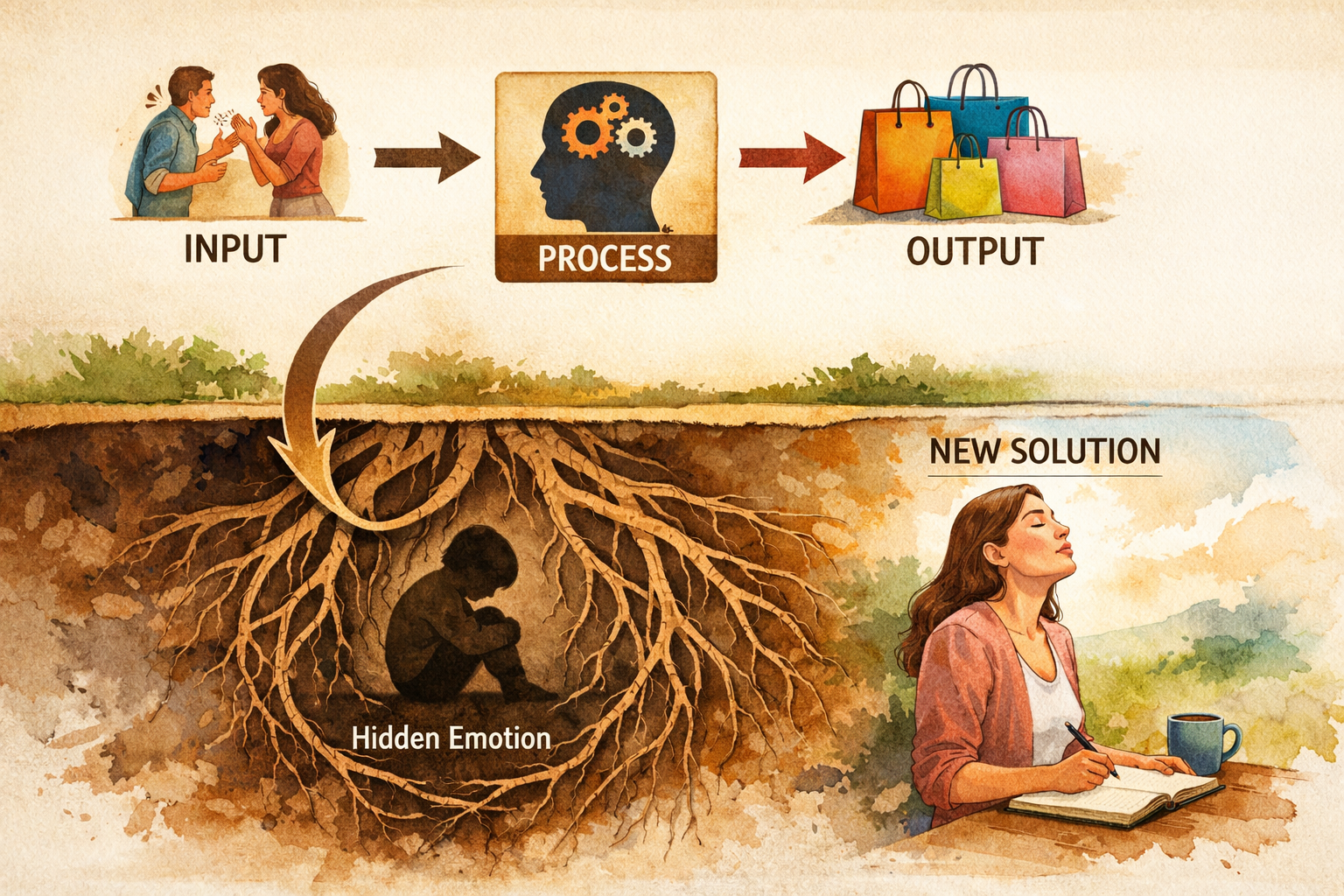 ورودی امروز (جر و بحث) → پردازش قدیمی (بیتوجهی = من نامرئی) → خروجی (خرید تکانشی)