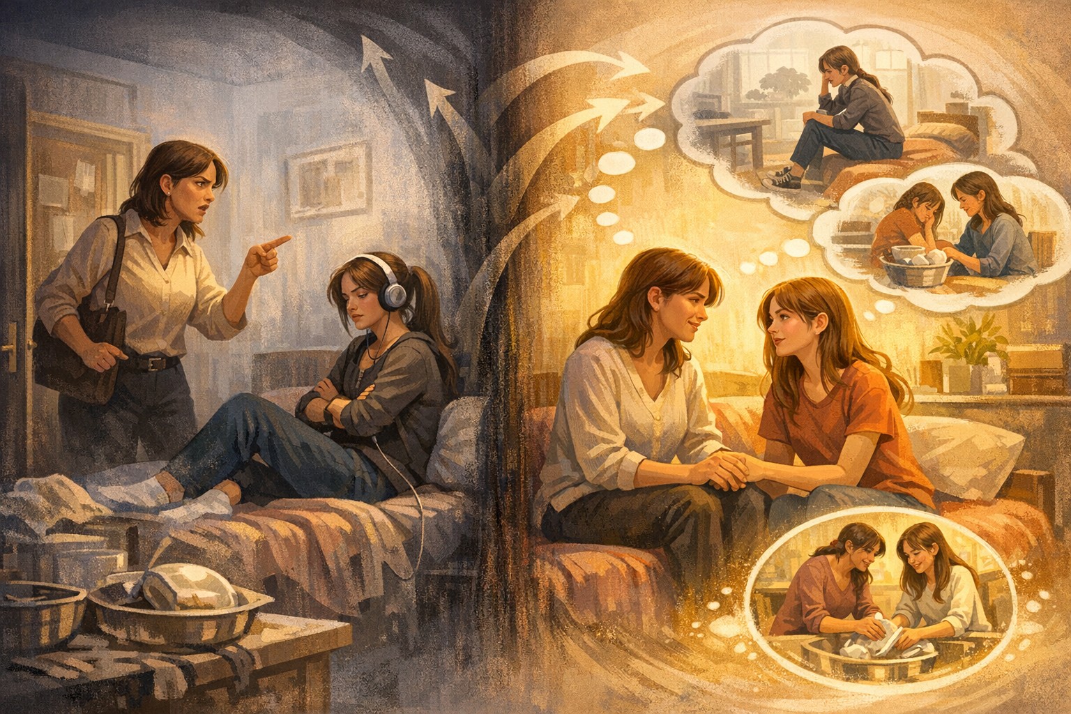 عصر یک روز کاری، مادری پس از بازگشت از محل کار متوجه میشود که دختر پانزدهسالهاش برخلاف قاعدهی توافقشدهی خانواده، ظرفهای ناهار را نشسته و در اتاق خود مشغول گوش دادن به موسیقی است. مادر که تحت فشار خستگی و تنش روزانه قرار دارد، با لحنی آمرانه وارد اتاق شده و بر لزوم رعایت قوانین خانه تأکید میکند. در این لحظه، الگوی تعاملیِ غالب، مبتنی بر رابطهای یکسویه و سلسلهمراتبی است؛ گویی والد، سوژهی آگاه و تنظیمگر است و نوجوان، ابژهای که باید هدایت و اصلاح شود.