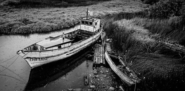 پورتو آیزن یک شهر بندری کوچک در جنوب غربی شیلی است. هوا در آنجا اغلب سرد و گرفته است، حتی در فصل تابستان. و باران زیاد می بارد. من داشتم در اطراف حومه شهر پرسه می زدم که به این قایق های چوبی قدیمی برخوردم. در ابتدا توجه من به جو و فضای این صحنه جلب شد – باران نرم نرمک می بارید، و در عکس اصلی کراپ نشده می توانید تپه ها را در افق ببینید که در میان باران ریز محو شده اند. صحنه در حالت رنگی خوب بود (عکس زیر را ببینید)، اما در مرحله پس پردازش من متوجه شدم که در حالت تک رنگ نیز به زیبایی ظاهر می شود.