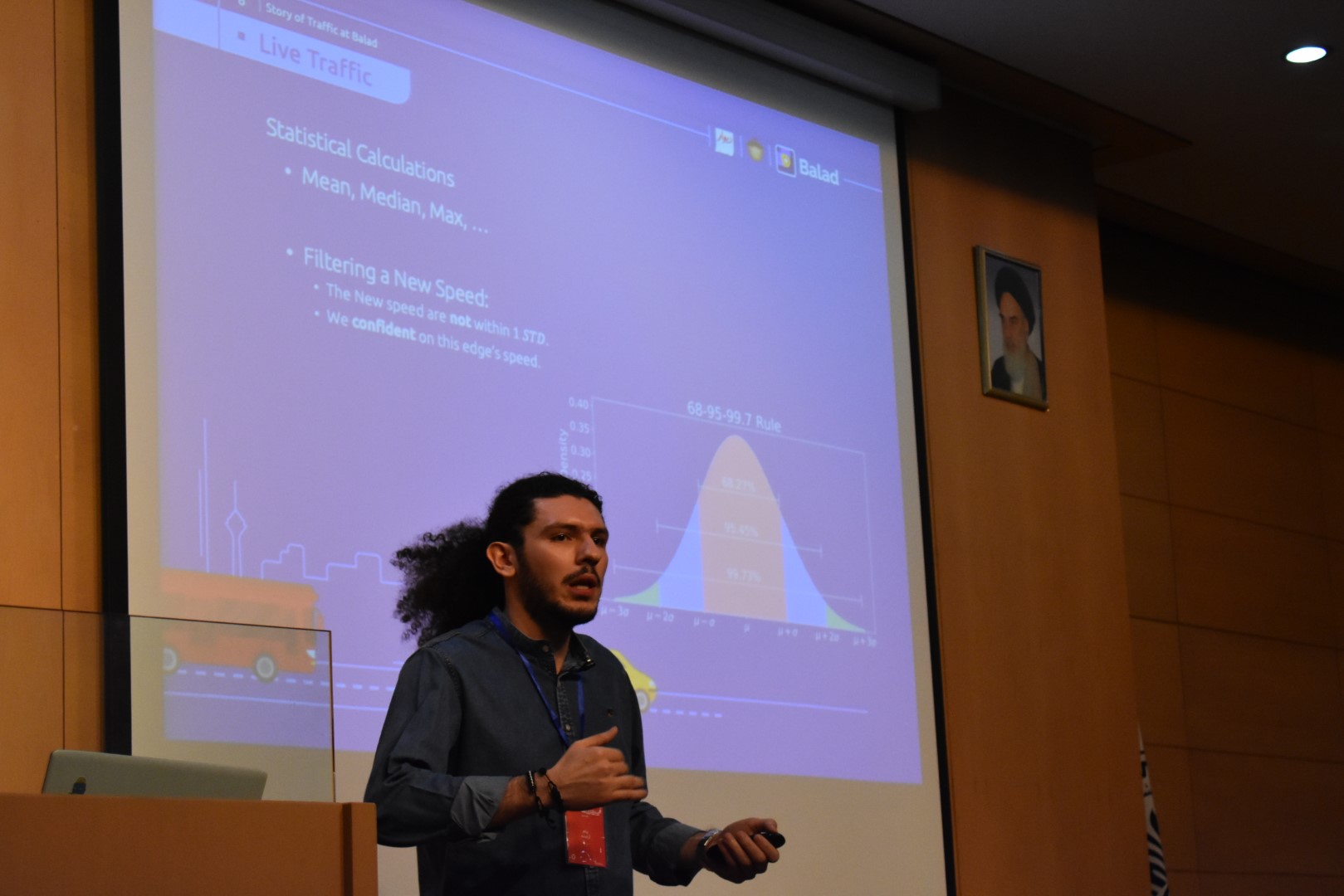همچنین پیام، حضار رو با موضوع نویزی که در سیگنال GPS ارسالی کاربران وجود دارد آشنا کرد و گفت با سیستم Map Matchingی که develop کردیم به چه شکلی این نویز رو برطرف میکنیم. بعد از برطرف کردن نویز سیگنال GPS، دربارهی نحوهی محاسبهی ترافیک لحظهای با استفاده از مفاهیمی چون Recency و Frequency و مفاهیم آماری و همچنین یادگیری ماشین به صورت تخصصی مطالبی بیان شد.
