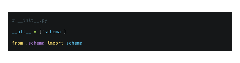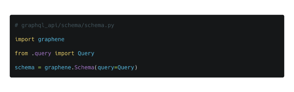 گرافین در پکیج graphql_api.schema دنبال متغیر schema خواهد گشت، مشابه ایمپورتها در پایتون. بنابر این پوشهی graphql_api/schema رو ایجاد میکنیم و توش چند تا فایل زیر رو میسازیم: