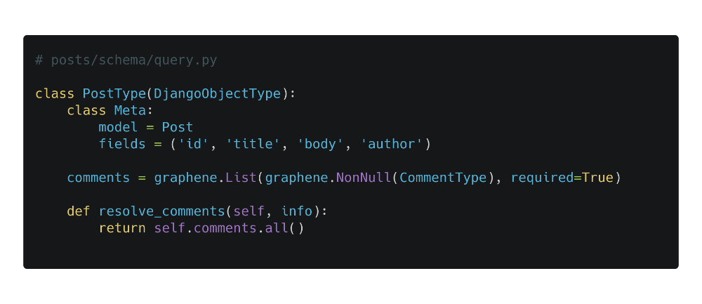 مقدار self در تابع resolve_comments یک پست است که از مدل Post ایجاد شده است (در این مثال دقیقا همان پستی است که از تابع resolve_post در PostQuery برگردانده شده است). بنابر این میتوانیم از تمام امکاناتی که مدل جنگو در اختیار ما قرار میدهد استفاده کنیم، مثلا لیست کامنتها رو بگیریم و حتی در صورت نیاز، فیلتر کنیم.