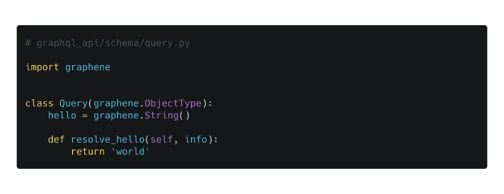 روش کار graphene به این صورت است که برای هر فیلدی که تعریف میکنیم به دنبال تابعی میگردد که با resolve شروع شود و در ادامه نام فیلد بیاید. به طور مثال برای فیلد hello به دنبال تابع resolve_hello میگردد و هنگامی که بخواهد کوئری گرفکیوال را اجرا کند و مقدار hello را بداند این تابع را صدا میکند.