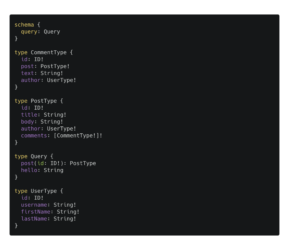 این چند خط داره میگه که متناظر مدل Post یک تایپ گرفکیوال وجود داره و فیلدهای id و title و body یک پست قابل کوئری کردن هستند. گرفین به صورت اتوماتیک خودش تایپهای مدل رو بررسی میکنه و تایپهای متناظر رو در گرفکیوال برای این فیلدها تعیین میکنه.