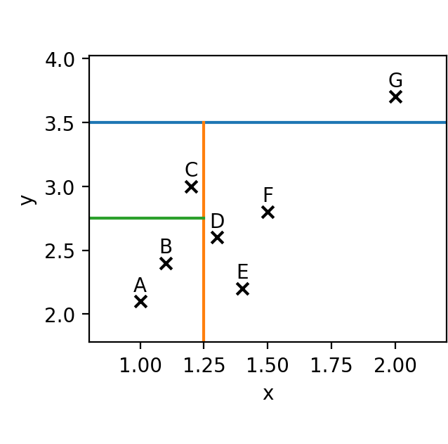 حال بهتر است به سراغ یک مثال آماریتر برویم و مجموعهای از دادهها را در مختصات دو بعدی x-y قرار بدهیم. این مجموعه داده را ابتدا از طریق یک بُعد (خط آبی) جداسازی میکنیم، سپس جداسازی با بُعد دوم (خط نارنجی) صورت میگیرد و در نهایت آخرین جداسازی (خط سبز) انجام میشود.