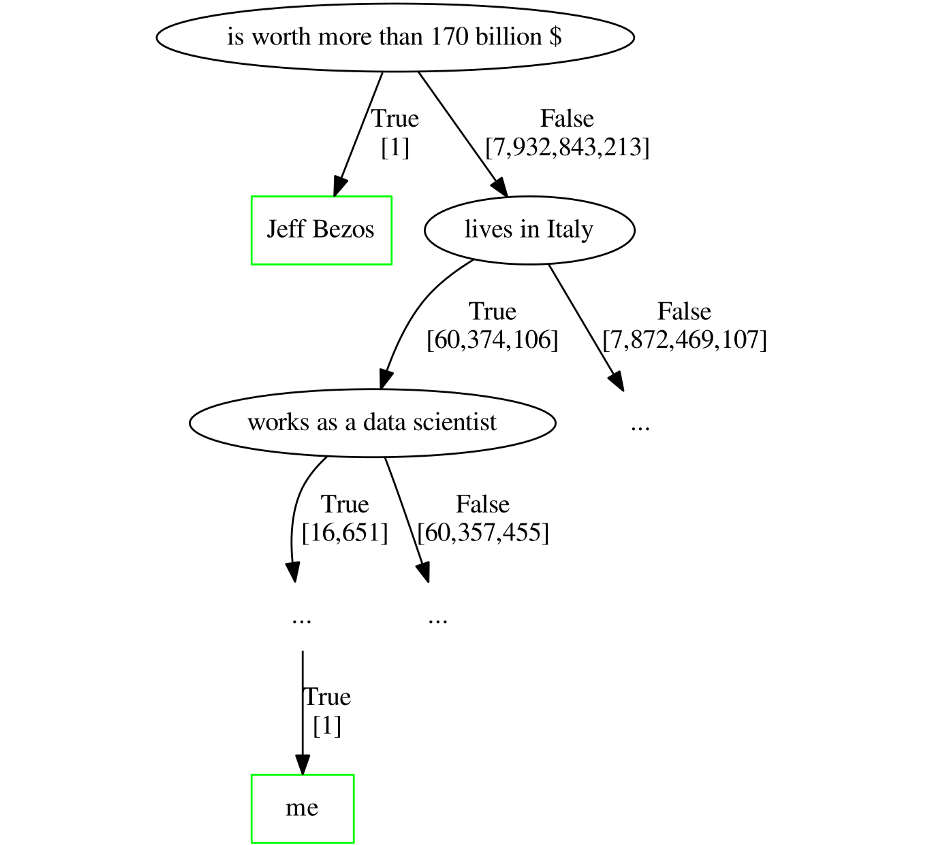 برای ایزوله کردن درخت جف بزوس، تنها کافی است این سوال را بپرسید که «آیا او بیش از ۱۷۰ میلیارد دلار دارایی دارد؟» اما از آن جایی که شخص جلیل علیزاده (نویسندهٔ مقاله) بسیار معمولیتر از جف بزوس است، برای ایزوله کردن او حداقل نیاز به پرسیدن ۱۰ سوال بله/خیر دارید.