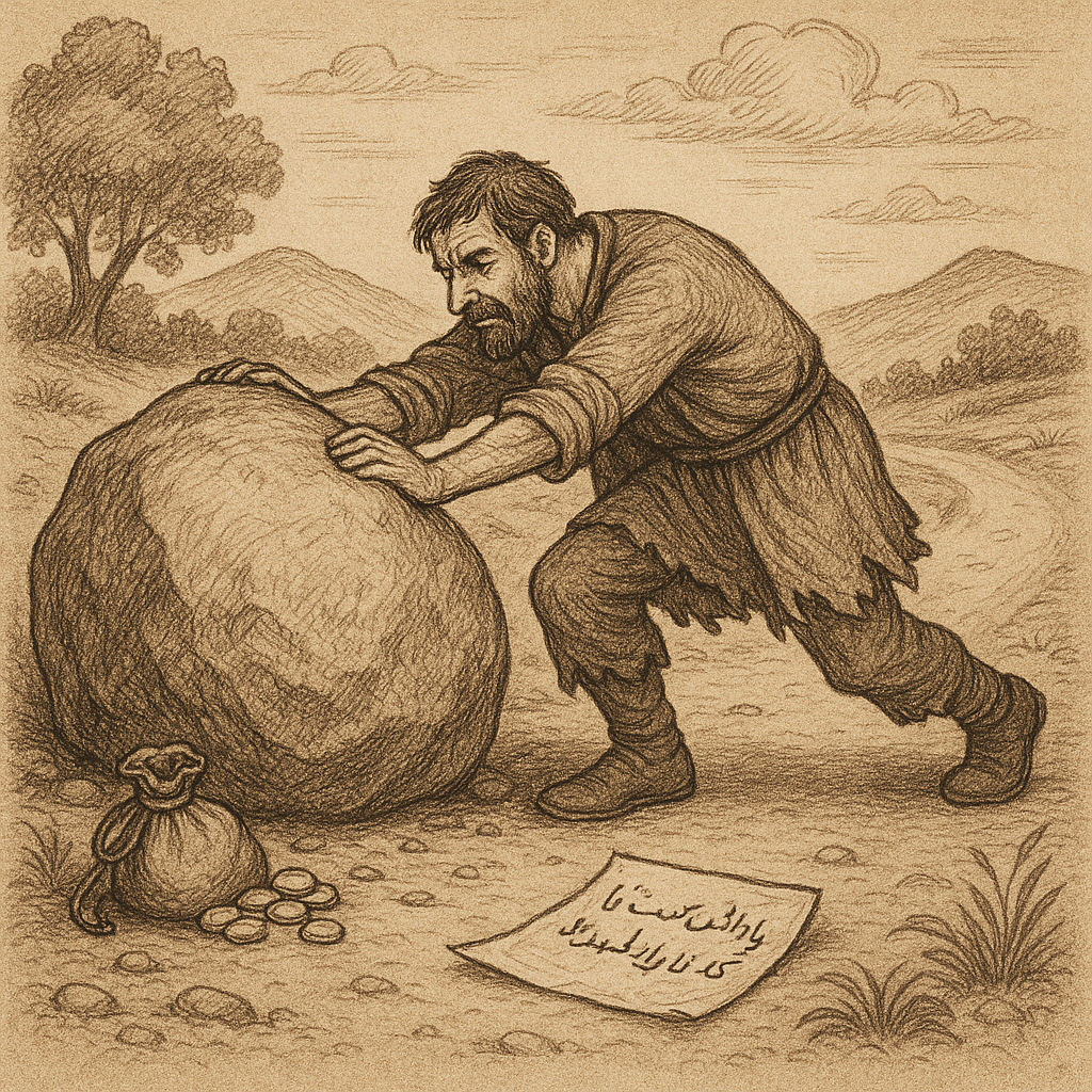 روزی پادشاهی سنگ بزرگی را در میانهی راه ورودی شهر گذاشت و پشت درختی پنهان شد تا ببیند چه کسی آن را برمیدارد. تجار، وزیران، و حتی سربازان از راه گذشتند، اما هیچکس سنگ را برنداشت؛ همه غر میزدند که چرا کسی این سنگ را برنداشته. تا اینکه مرد فقیری آمد، بارش را زمین گذاشت و شروع به هُل دادن سنگ کرد. پس از تلاش زیاد، سنگ را از راه کنار زد. ناگهان دید کیسهای پر از طلا زیر سنگ است، و یادداشتی که نوشته بود: