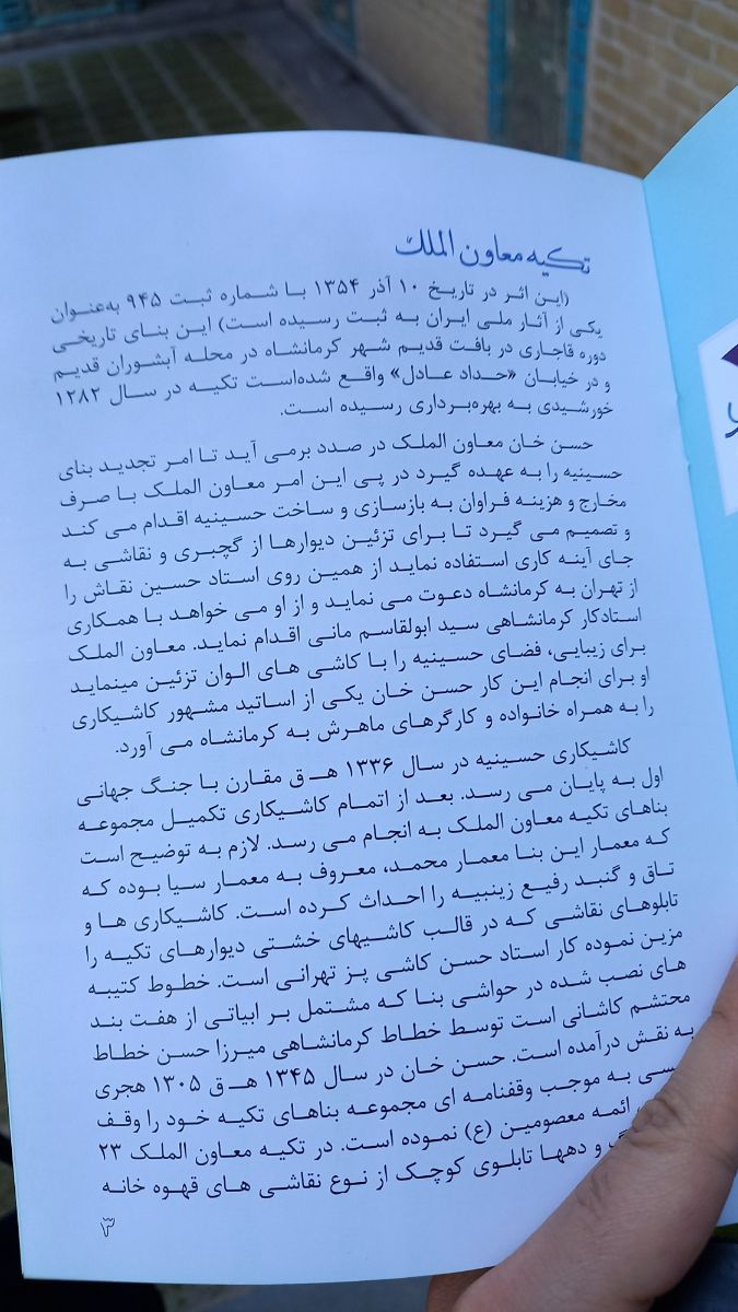 بعد رفتیم و آب هویج بستنی خوردیم و فالوده و طی یک حرکت تبلیغاتی محمد آقا فالوده بهم می داد و عکس میگرفت تا بعد به پدر خانومش نشان بدهد که ما حسابی هوای پسرتان را داشتیم. بعد از آنجا رفتیم تکیه ی معاون الملک که فکر کنم خیلی کسی که به کرمانشاه میرود نشناسدش. ولی خیلی جای باحالی بود. مربوط به دوران قاجار بود و آن بنده خدا یک مجموعه ی هنری پر از نقاشی های دیواری درست کرده بود. روی دیوارها عکس همه ی پادشاهان و اساطیر را کشیده بود. عکس ائمه را کشیده بود. نقاشی جنگ ها را کشیده بود. خیلی چیزها داشت. یک عکسش خیلی منشوری بود فقط که مثلا آمده بود انتقام مختار را بکشد. یک صحنه ی نبرد را کشیده بود و مختار را که داشت مردی لخت را از وسط دو نیم میکرد و به عبارتی جر میداد. تکیه را پرسیدم یعنی چه؟ گفتند یک چیزی تو همان مایه های حسنیه است. و ساختمانش هم قشنگ بود و شیشه کاری ها و آیینه کاری های قشنگ داشت.